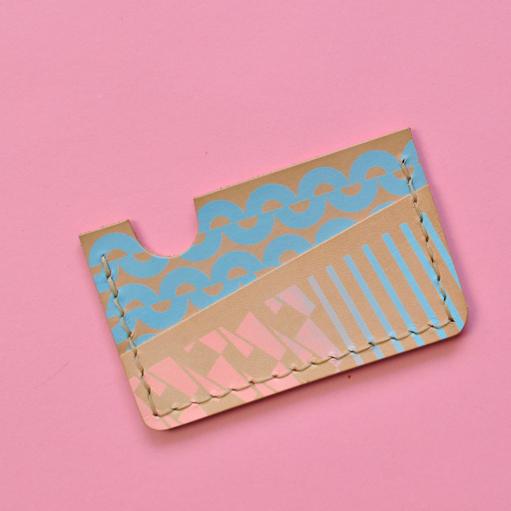 Constructed entirely from our studio scraps, these little card wallets have two pockets, holding upto 5-ish cards. All hand stitched, they measure 4.25" wide, 2.60" tall. These wallets are made is a variety of silkscreen and marbled leathers in a blend of fun colours making each one slightly unique. This one-of-a-kind, as pictured, is the exact one you’d be getting.